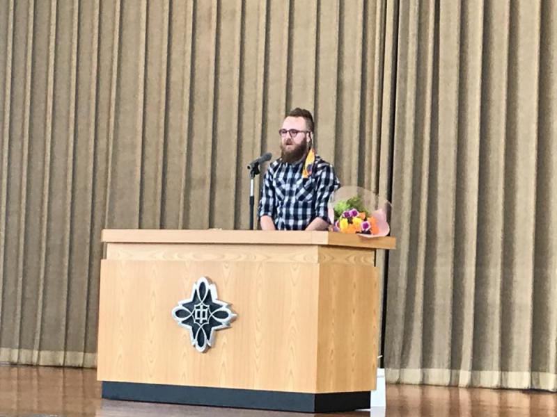 今年度初めての全校朝会が行われました。今日でALTシェーン先生が本校での勤務を終わられアメリカに帰国されます。朝会でお別れ会を行いました。代表生徒からお別れのメッセージが述べられ、花束と一人一人からのメッセージカードをお贈りしました。2年間ありがとうございました。