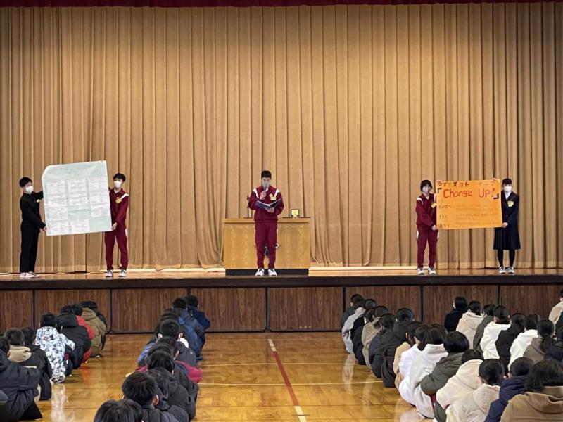 全校朝会にて新生徒会役員からゆずり葉活動のテーマ「change up」の重点の確認と各委員会が取り組んでいるライフアップ作戦の中間の振り返りの報告がありました。