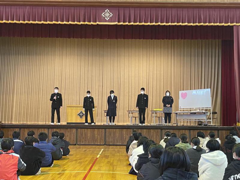 全校朝会にて、保健委員会による寸劇の発表がありました。内容はSNSや校内生活での人間関係トラブル防止についてです。