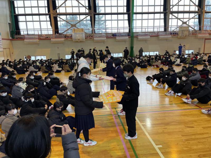 全校朝会にて3年生の進路実現に向けて激励会が行われました。1、2年生から激励応援と絵馬の贈呈がありました。