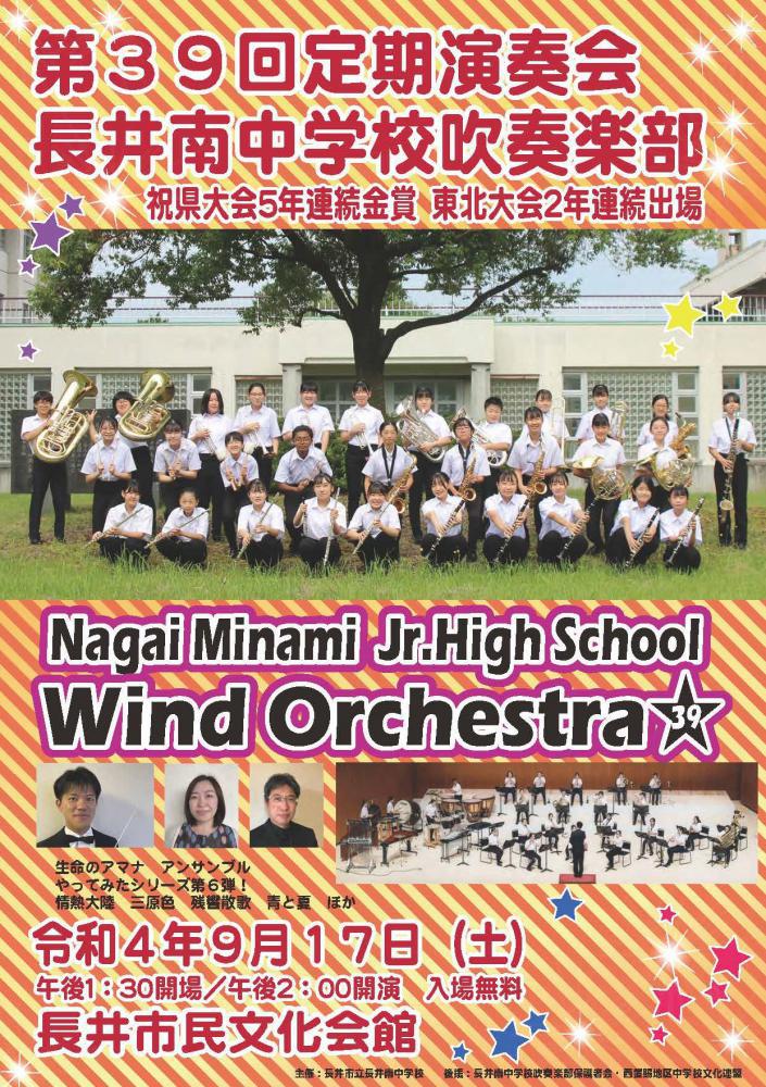 長井南中学校吹奏楽部第39回定期演奏会が令和4年9月17日(土)に長井市民文化会館にて行われます。開場13:30 開演14:00 入場無料です。入場制限はありませんが、受付にて検温表へのご記入をお願いします。