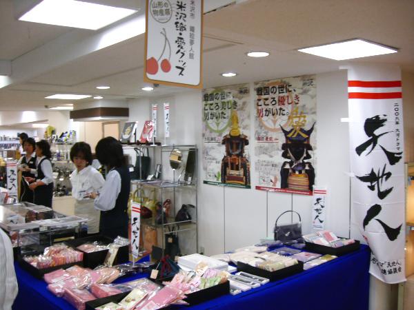 只今開催中の川崎さいか屋「第18回山形県の物産と観光展」では、大河ドラマ「天地人」コーナーを設け、「愛」の兜やのぼり旗、ポスター等を展示し、PRしております。