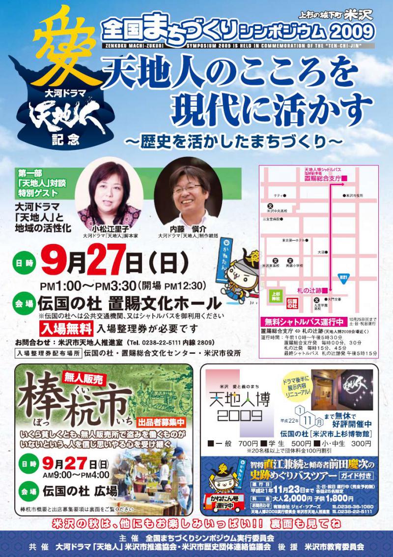 大河ドラマ「天地人」の放送記念イベントとして、全国まちづくりシンポジウム2009「天地人のこころを現代に活かす〜歴史を活かしたまちづくり〜」が開催されます。