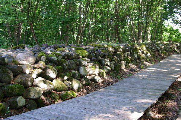 「野面積み」と呼ばれる川原石を積み上げた技法で、建造当時の姿を保っています。積み上げた石が蛇のウロコのように見えることから、「蛇堤」と呼ばれるようになったようです。