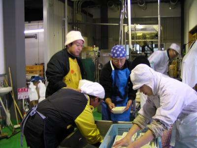 出来た豆腐をパックに入れています。