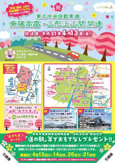 東北中央自動車道の南陽高畠IC・山形上山IC間が4月13日(土)に開通します。 開通を記念して、山形県置賜(おきたま)地域の道の駅や観光立寄施設など合計11施設で、訪れた方にちょっとした名物などを先着でプレゼントする企画を行います。 プレゼント引換券付きのチラシを持って、ぜひ置賜に来てね。 【実施日】4月13日(土)・14日(日)、20日(土)・21日(日) ※各施設ごと、開業時間中に限ります。 ※プレゼントは、お一人様、1ヶ所で1つになります。 【チラシ配布場所】 山形県内で置賜以外の地域、宮城県、福島県、新潟県で新潟市以北の道の駅や高速道路SA・PAなど。 |