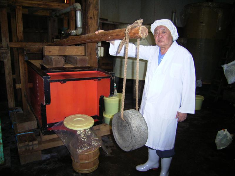 江戸時代から伝わる古式梃子の天秤に約10キロの重しをかけ、もろみを1週間かけて搾る。ここで、出来た「生揚げ醤油」は濁りがなく、清冽な味がする。