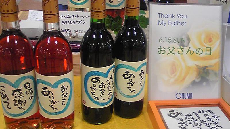 明日は父の日。“ことばのアート”安部春彦氏と大沼デパート米沢店にて、父の日用のオリジナルメッセージ入りのワインを販売してます。今日と明日2日間だけの催事です。
