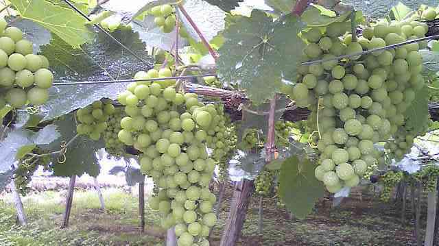 今現在の赤ワイン用ぶどう品種のブラック・クィーンの画像だっし。実は固く色もまだ緑ですが、房成りが原型になってきました。