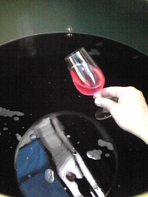明日、粗濾過(軽く濁りをとる濾過)する『赤湯ヌーヴォー(ロゼ)2008』になるタンクのワインです。ロゼなので、きれいになるように今日色の調整をしました。