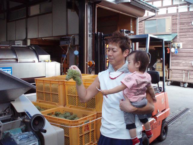 シャルドネとは、白ワイン用の高級ぶどうで、実が締まって小さくゴロっとした形の緑の果皮の品種です。天候の恵まれたおかげで、昨年同様今年のシャルドネも糖度が高かったです。搾った果汁も甘ごいっけ。んだげんと、ワイン用ぶどう品種なので酸味もしっかりしてました。