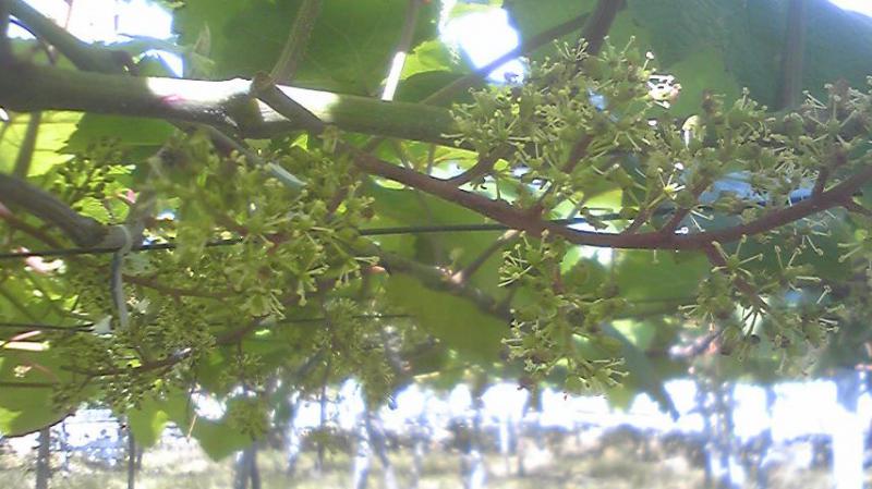 画像は、今現在の松沢地区のマスカット・ベリーA。線香花火のように、幼実に花が咲いて、きれいな時期です。
