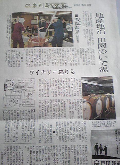 日経新聞の日経プラスワンに温泉列島再発見という記事があります。その記事に赤湯温泉のことが記載され、その温泉場にあるワイナリーということでおらいも紹介されてます。赤湯温泉瀧波の社長さんに、この記事を書かれている札幌国際大学松田教授を紹介していただきました。