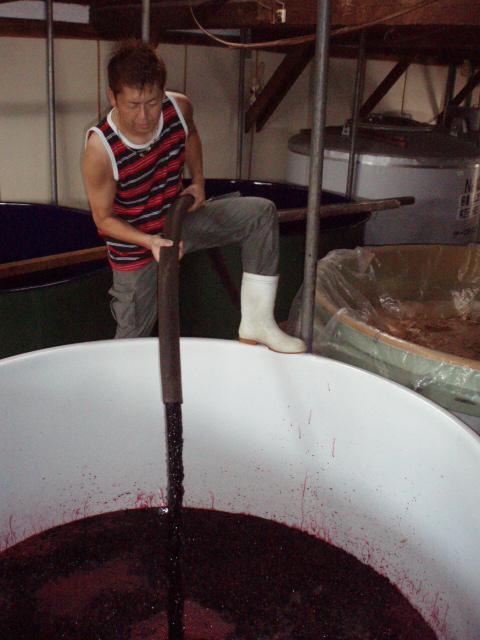発酵初日から約1週間から10日間ほど、赤ワインの場合は櫂入れという作業があります。画像は櫂入れと同じようなことで、発酵液をポンプで循環させ、皮、種、実に浸すポンピングシャワーという作業。この作業をすることで、皮から色が出て、種からポリフェノールが抽出されます。あと、醪の表面の雑菌の繁殖を抑えます。