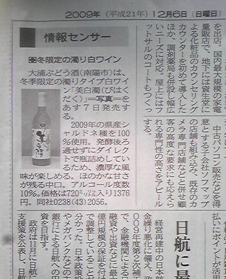 今日の山形新聞の情報センサーに、明日から発売の無濾過にごりワイン『美白濁』を掲載させて頂きました。