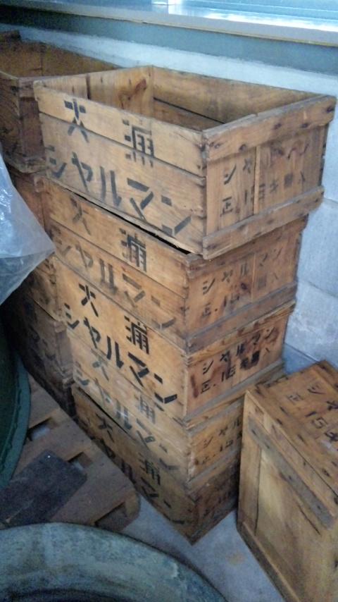 今日は暑い中、エアコンも何もない資材倉庫の片付け作業。瓶などを整理していたら、倉庫の奥から昔使っていた、収穫したぶどうを入れる木箱が大量に出てきました。今でこそ、プラスチックの18キロ入コンテナだげんと、その昔この木箱を農家に配って、ぶどうを入れてもらっていたようです。