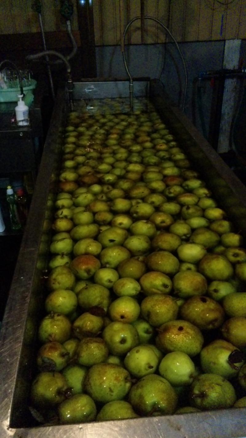 加工用のラ・フランスやリンゴをお預かりして、720ml入りのジュースに加工してお渡しします。明日は今年一回目のラ・フランスジュース。ということで、今日はその準備。水槽さ入れて(画像)、洗って選果して水気を切ってから搾ります。ストレート100%なので、コクがあるジュースになります。