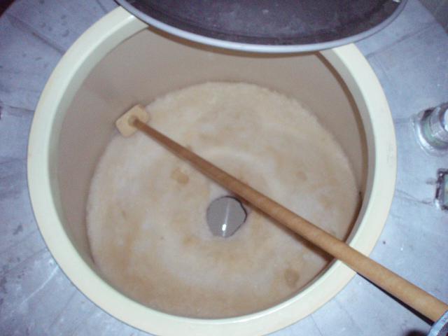 ナイアガラの果汁の余分な水分を凍らせ、糖度を30度以上に上げました。タンクの回りは凍ってだげんと、中央部分に凝縮されたかなり甘ごい果汁が残ります。その部分を違う発酵タンクへポンプで汲み上げて温度を加えながら発酵させ、極甘口タイプを造ります。この仕込みが終わると、今年のワイン仕込みが終わりになります。気抜がねでさんなね。