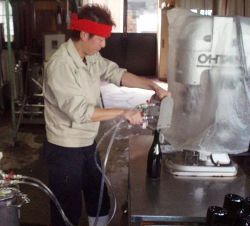 1本ずつ詰めて最後は王冠で打栓。昔ながらの手動式打栓機。