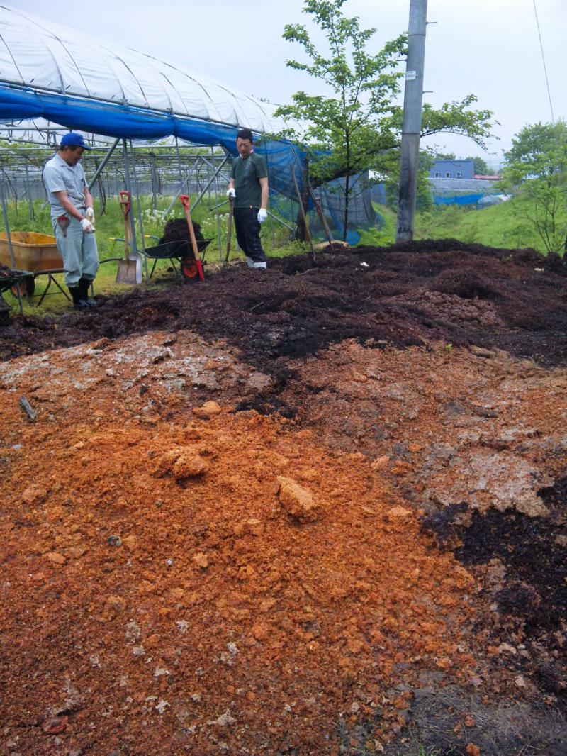 一輪車でぶどう畑に運び、フォークで均等に樹のまわりに蒔きます。