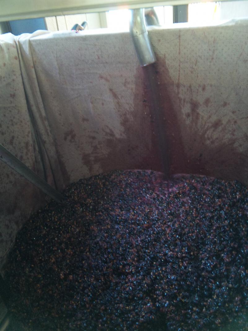 今日は濃厚な色合いで力強い酸味を持つブラック・クィーンというぶどうで、原液(ストレート100%ジュース)の仕込みを行ないました。除梗後に実を潰すまではワイン仕込みと同じだげんと、その後加熱出来る圧搾機さ送って、しばらく煮ます。煮ることによって色やコクが出てきます。加温をやめて次の日までおいて、あとは搾って瓶詰め。ワイン仕込みと違い、原液仕込みは一日勝負なのでかなりハードです。