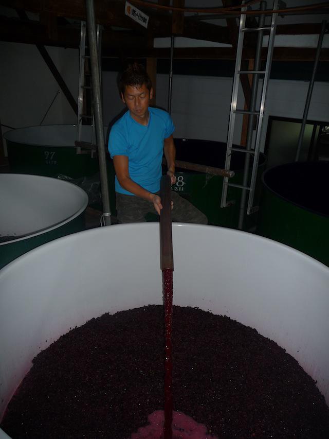 明日か明後日、引き抜く予定のカベルネ・ソーヴィニヨンのタンクです。赤では一番最後の仕込みになるので、このポンプオーバー(発酵液を循環させる作業)も今日か明日で最後になります。色を濃く出すように今年はこのポンプオーバーを朝、晩2回ずつ行ないました。