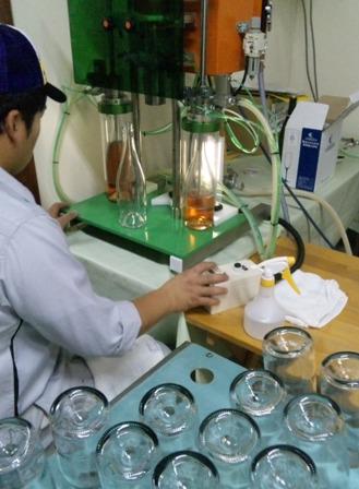 この度スパークリングワインの製造をしったげんと、今日2回目の充填作業(1回目は5月末に指導を受けながら白を充填)を、ほんのりと優しい甘さを感じるロゼのスパークリングで行ないました。まだまだ慣れねげんと、なんとか充填完了。