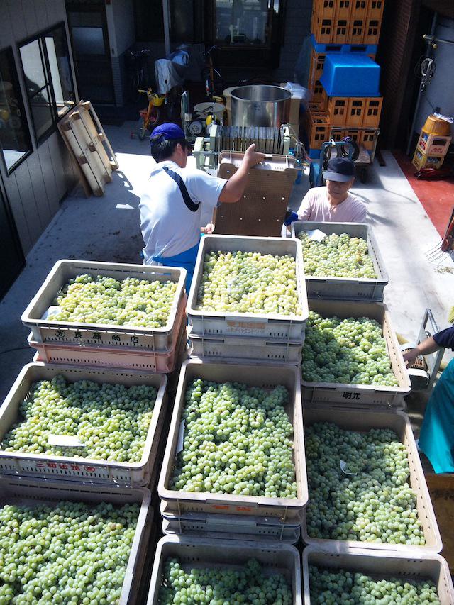 今日はとっても香りが良いぶどうで有名なナイアガラでのワイン仕込みでした。約5トンを除梗破砕機に入れ、プレス機で搾り果汁にしました。