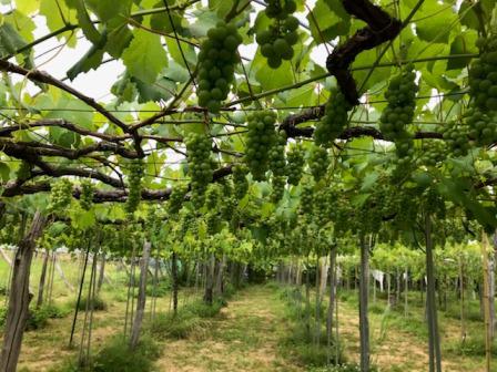 カラッとしない天気が続きますが、ぶどう畑の作業も忙しくしています。ぶどうの肩の部分を切る作業が終わり、だいぶ形が出来て来ました。まだ実が固いですが、これから色が付いて来ると鳥が食べに来るのでネットを張る作業も残ってます。