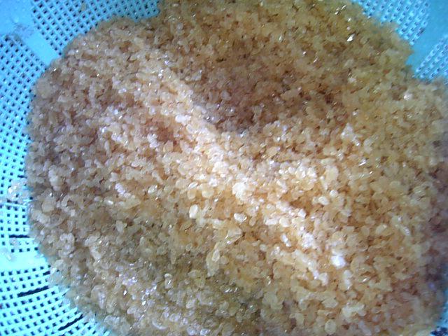 画像は、本日濾過したデラ・ウェアー果汁の酒石酸です。黄金色の米みたいだげんと、この酒石酸というのはぶどうに含まれているもので、ぶどう果汁、またはぶどうで造ったワインを長期間冷やす(0℃くらいで)と結晶状になります。