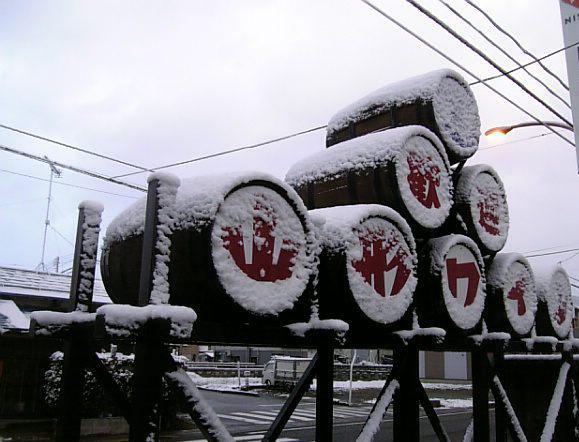 おらいの駐車場にあるワイン樽の看板も雪化粧です。