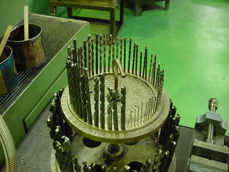 私達の工場はこのような「ドリル立て」といわれるスタンドに0.1ミリ刻みで用意をしておき、用途に合わせてそれを使うようにしています。