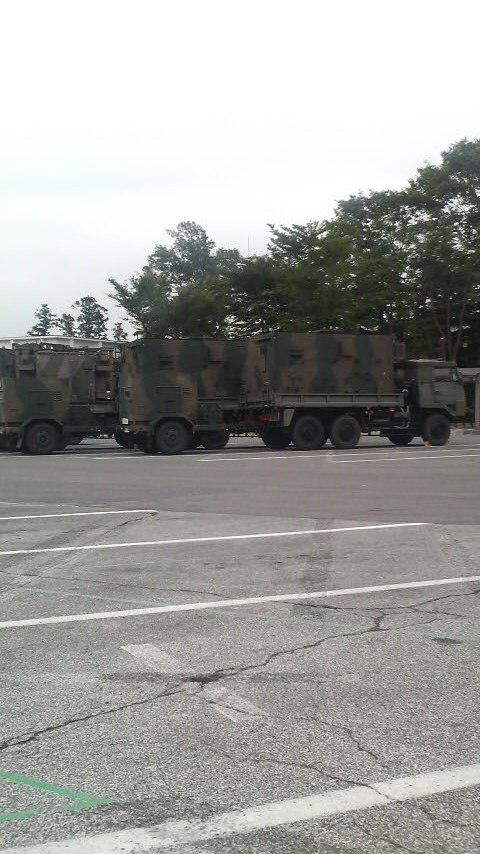 車で出発しようと、エリアの中を移動したら、自衛隊の車があり、「災害派遣」と書いてありました。