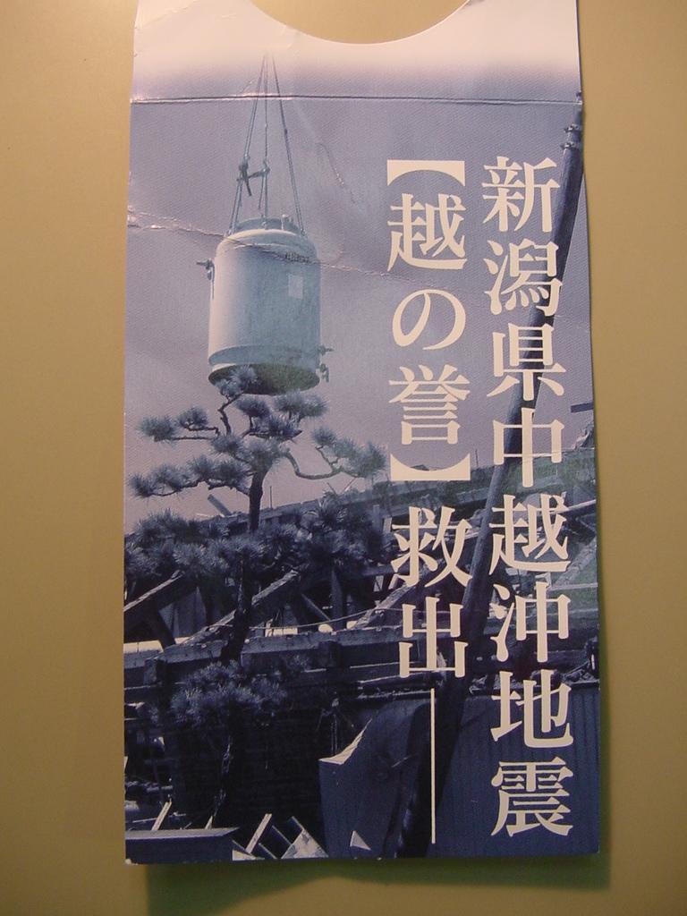 ◎ 復興酒のぶら下げラベルです。クレーンで樽を救出したそうです。凄いなぁ。