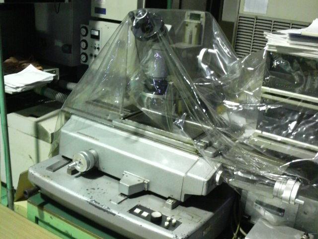 これは倍率の高い顕微鏡に、横軸と縦軸に動くテーブルがついていて、顕微鏡で覗きながらテーブルを移動させて、そのテーブルの移動距離を測って(デジタル表示です)寸法を測定するというものです。