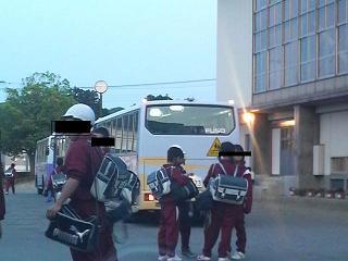 スクールバスが3台待機、子供達がそれぞれ部活を終えて集まってきます。
