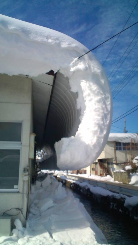 今日は暖かいので屋根の上の雪が全体的に動いているみたいだ。