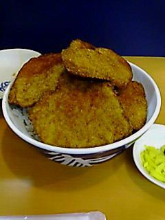 ごはんの上にカツが5枚も乗ってるんで、丼のフタにカツを移さないとごはんを食べれない・・・。