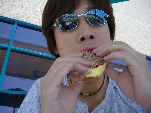 で、今日は、いつものべーグル屋さんで遅めのブランチ。アメリカ食は基本的にマズいが、べーグルだけは正直旨い。頼むのはいつも、すべての香辛料がのってるべーグル(Everything Bagel)。旨いです。いつもはクリームチーズで。でも、今日はお腹が減っていたので、卵焼きとハム、スイスチーズを挟んで贅沢に。ボヘミアンコーヒーをすすりながら、マッタリとしたひと時を楽しむ。明日も行こーっと。