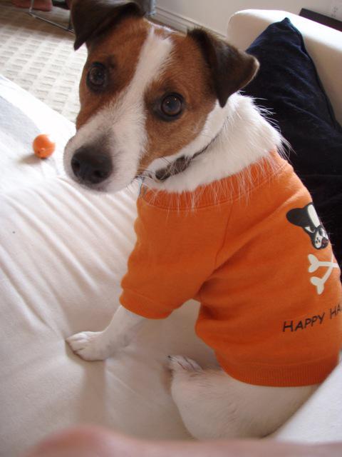 そして、わたくしたちも親バカっぷりを発揮中。最近朝晩がめっきり寒くなったし、もうすぐハロウィーンということで、うちの暴れん坊のROY君にトレーナー着せちゃいました。最初は相変わらず嫌がってたけど、すぐに慣れて意外にお気に入りのご様子。珍しいカメラ目線の写真が撮れたので早速アップ。それにしても、自分の犬なのに何度見てもカワイイ…。