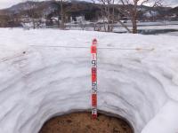 桜コースの一番付近ですが、今朝現在で155センチ。 これでも去年と比べればグーンと少ない少ない。 今晩から明日にかけて、大嵐が来るというので、とても楽しみにしてます。 なんで? もちろん雪解けが進むからですヨ。時々アップしますので見て下さい ネ。 |
