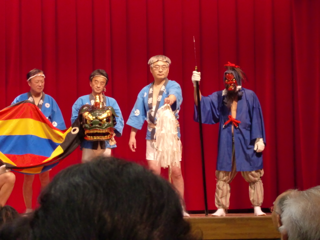 ダーーーーッと場内に走ってきました。 その後、天狗さまが登場〜。 なんでも、各家々を走ってお祓いするとか・・・・。 おしっさまは緑色です。