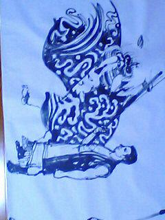 見ずらいでしょう?すみません。ちゃんと加工してからだすべきですよねぇ。でも新鮮な情報みたいでいいでしょう?イメージを下書き無しで描くので構図や動きに不備が出るけどタッチに勢いが出るんですよね。このシーンは警護掛りで獅子が警護の後ろを8の字を描く所ですね。五所神社の獅子の振りかたにもこういう動作がありますよね。早く送信しないとログアウトしちゃう!