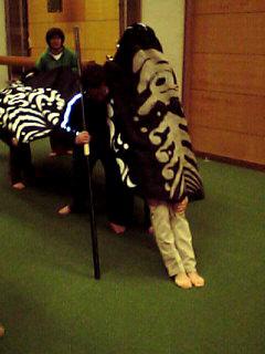 警護の持ち方で獅子振りが苦しかったり楽だったりします。警護が警護掛かりを経験してみるとわかるんです。警護の肩が獅子振りの腰に決まっていないと獅子の腰が折れ獅子が立ってしまいます。獅子がもっと後ろに反って警護が腰をもっと落としてくれればいいのですが・・・。でも足が綺麗に揃ってさすが母獅子の見せ場ですね。しかし幕が短いね。今日重くて長ーーーい幕と取り替えます。10メーターもあるんです。