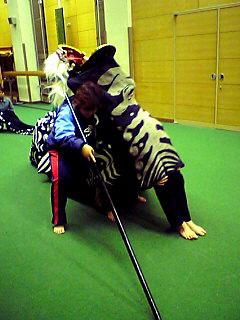 警護の演技力も獅子舞には必要ですね。闇雲に押してばっかりではいけないし、すぐに入っちゃったら面白くもなんともありません。いかにも本気を出しているかのごとく盛り上げなくてはならないのです。実際のお祭りの獅子舞やビデオでいろいろ勉強する事ですね。警護の「威厳」を出せればすごいんです。最近そういった警護って少なくなりましたね。先日前歯の抜けている警護見ましたがあんまり威厳は感じられませんでしたよ。何処の警護だったかな?
