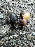 愛をささやくデンデンムシの雄と雌。あわやペッシャンコ!車の車輪10センチずれたところでそんな危険など知るよしもありません。