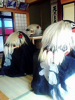 2頭の獅子が出番を待っています。前幕を噛んで眠っているようです。そこに新しい獅子が仲間入りしました。末永くよろしくお願いしますと生みの親は深々と頭を下げるのでした。