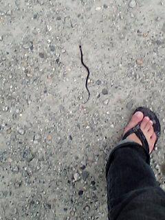 針金が落ちてるかなと思ったら子供のヘビでした。首のツケネに鮮やかな黄色の蛍光色のラインがお洒落です。逃げる素振りもなくマイペースで進んでいきます。私とこのヘビの重さを5gとして比べると13400倍になり、ゴジラと人間ぐらいの対比になるのでしょうか?足音しないのかな?