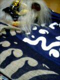 限りなく黒に近い濃紺が思い余って青になってしまいました。染屋さんの気まぐれなのでしょうか?ダメダシをしてきました。なんかいつもと違う出来上がりに納得いきません。獅子の幕は野川の清流を象徴したものと聞きます。まぁ浅い川と考えればいいのでしょうかねぇ?小学生低学年用の幕として使用する事にしました。