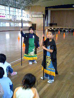 二人警護に衣装を着せました。可愛いですね!大人用の羽織をチクチク縫ってつめましたが時間が無くてすごい縫い方です。警護棒も子供用に軽く細く作り、化粧回しも大きさはぴったりでした。一つは「学」という文字をシコ名にして刺繍を取り付けましたが、片方はまだ未定です。誰かふさわしいシコ名を考えてもらえませんか?